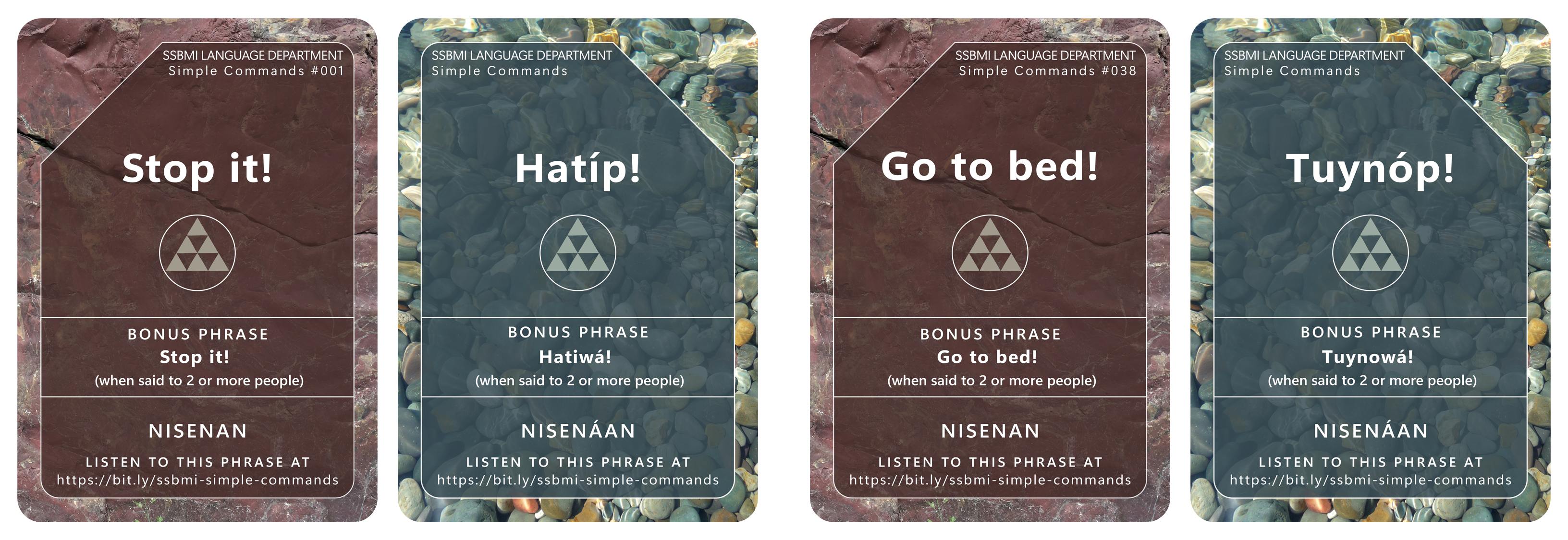 The SSBMI Language Department created this set of flashcards for learning simple commands in the Nisenan language. These flashcards focus on commands people often use with children and pets, like Hatíp! (Stop it!). Here, you can listen to the language on the cards and learn more.
