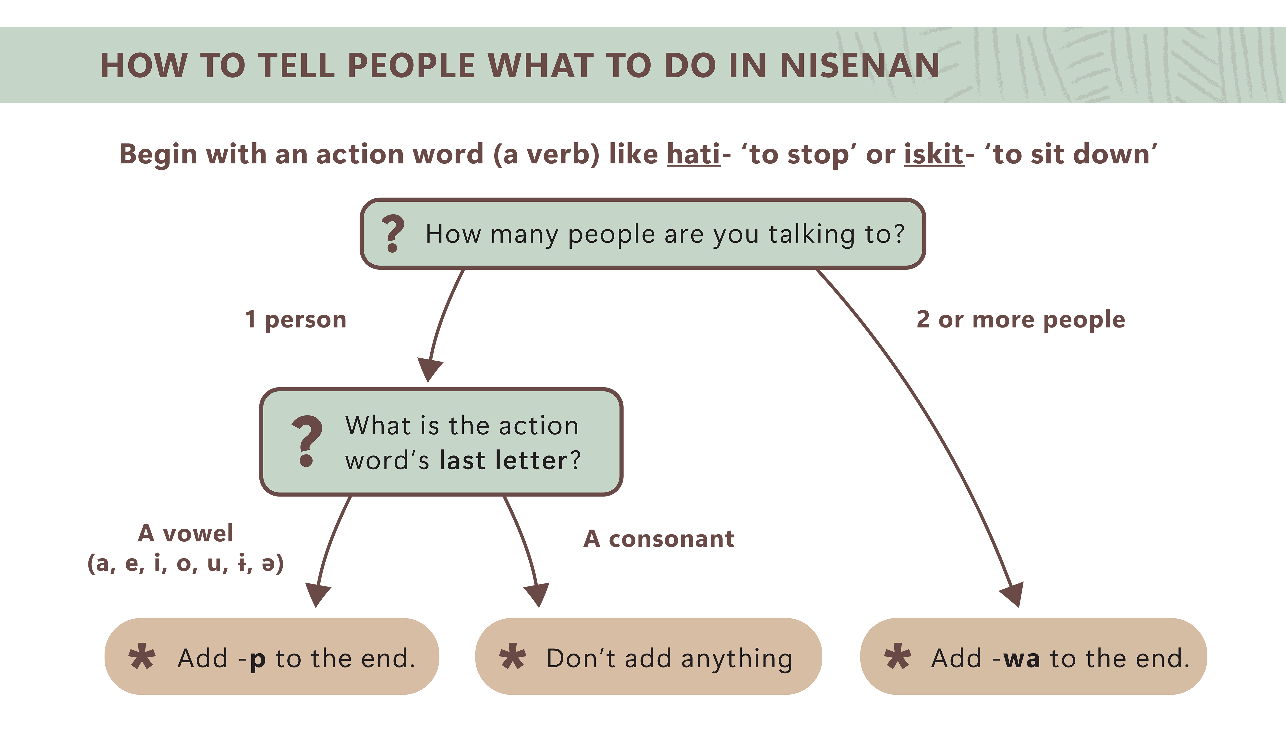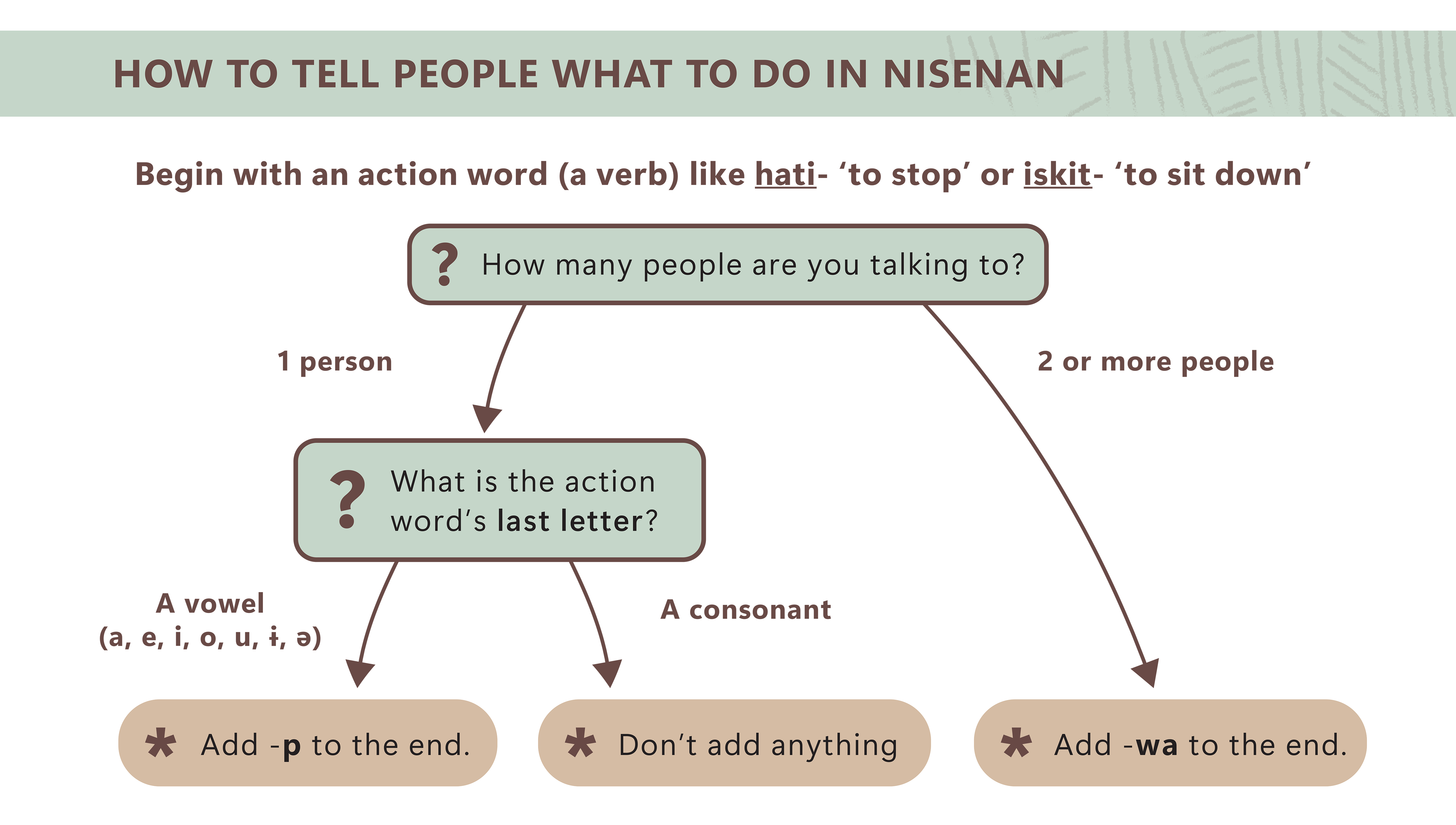 Want to try it? You can download this flowchart and a set of practice exercises, which you can use to practice forming commands in Nisenan.
