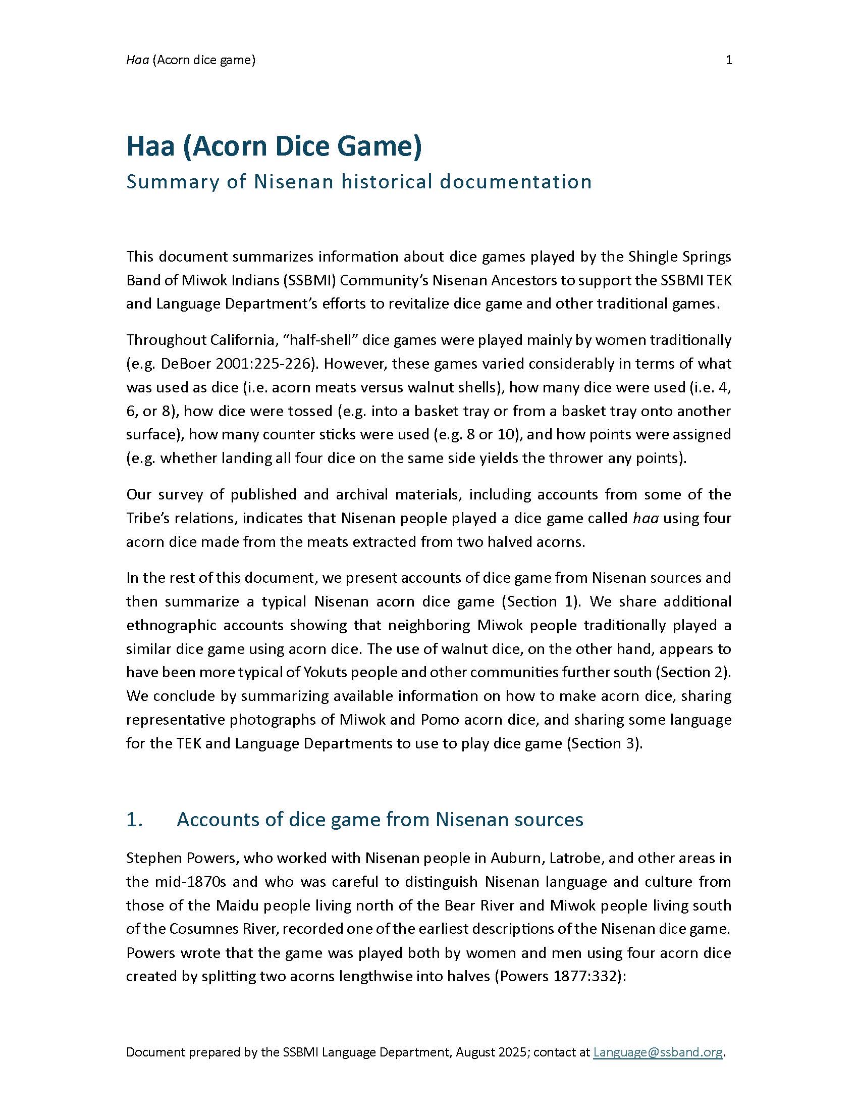 The SSBMI Language Department made this webpage to share Nisenan language for playing acorn or walnut dice game. Below, you can listen to the Nisenan language in the Haa Lumaydí (Dice Game at Big Time) zine that the Language Department shared at the walnut dice game tournament during the Shingle Springs Rancheria's Lumáy (Big Time) in 2025.