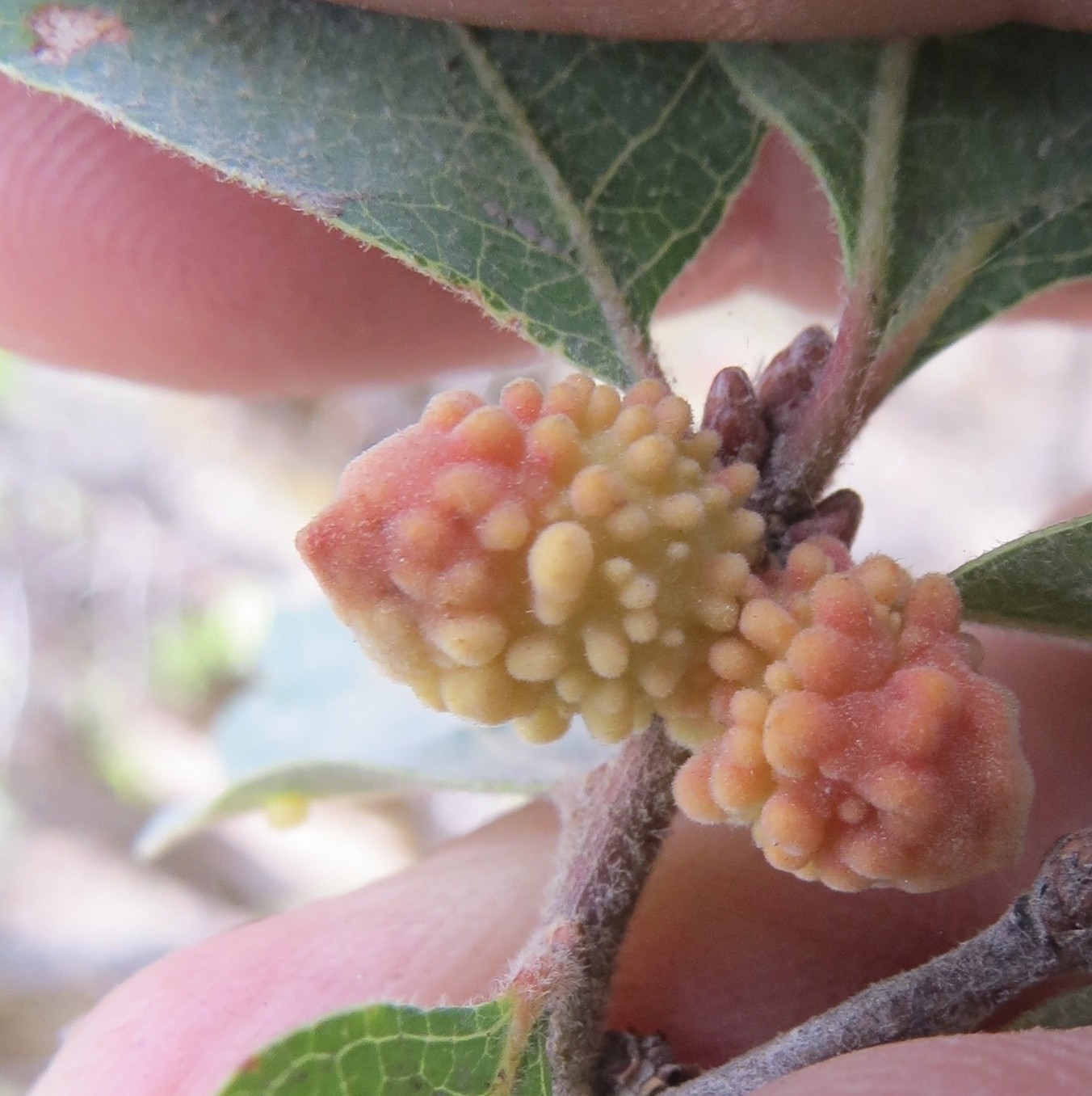Galls of Coral Gall Wasp on Blue Oak leaves (photo by Garth Harwood, CC BY 4.0)